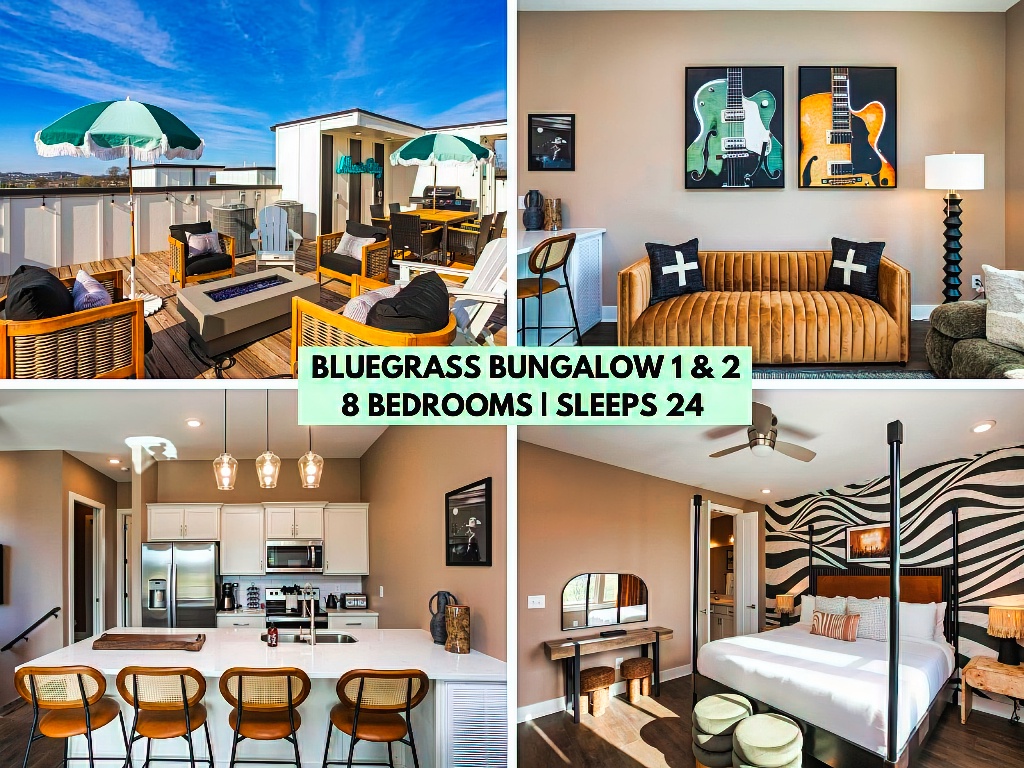 Bluegrass Bungalow offers an expansive layout, complete with a fully equipped kitchen and eight bedrooms, each boasting its own en suite bathroom and beauty bar. Perfect for accommodating up to 24 guests—whether you're planning a family reunion, celebrating a milestone, or throwing an unforgettable party.