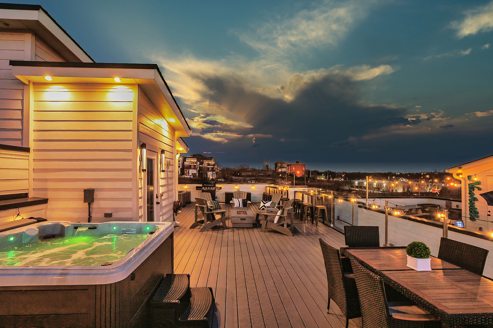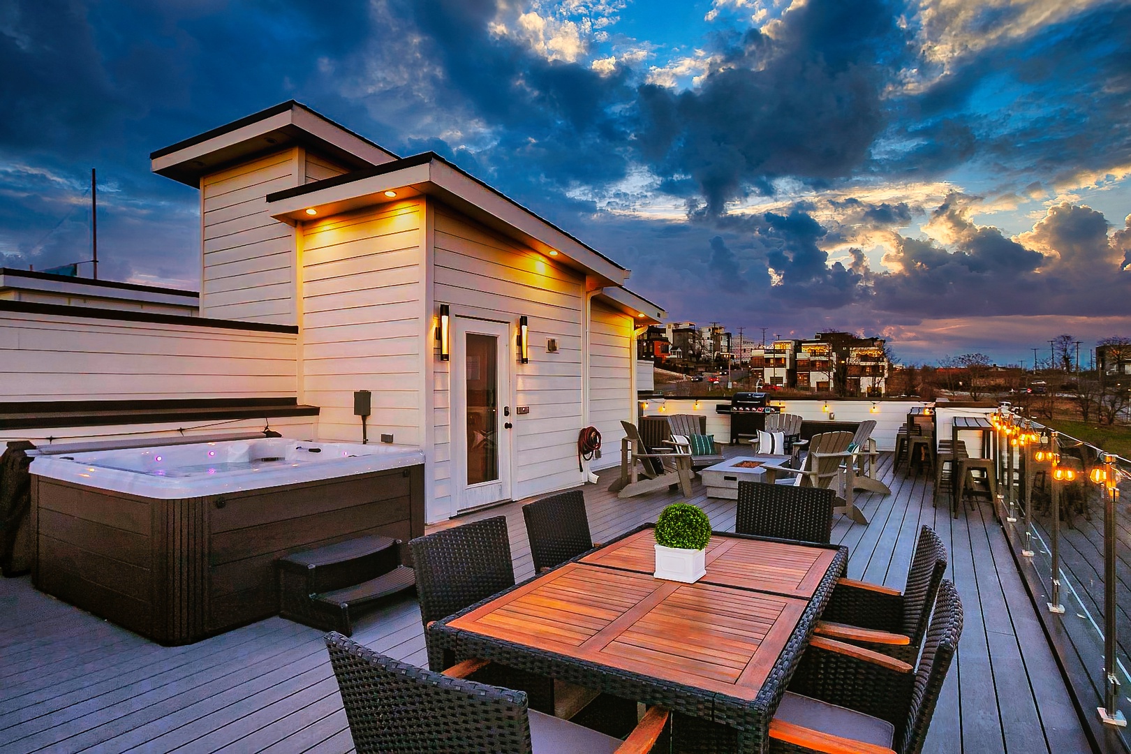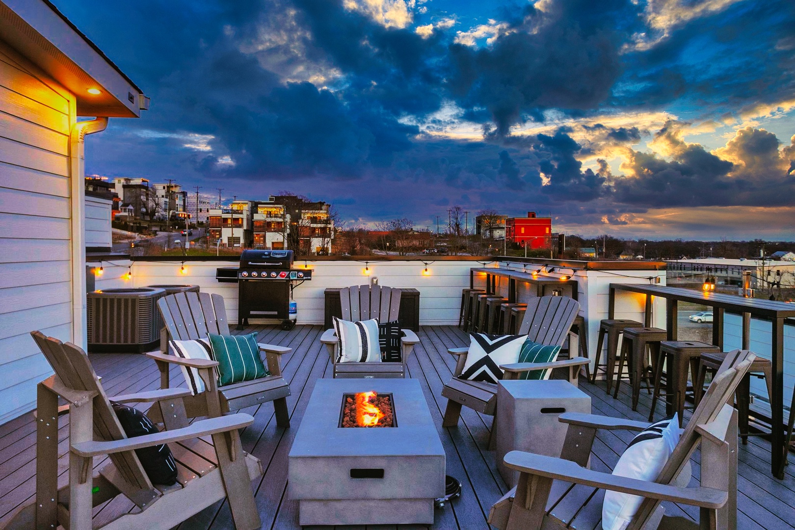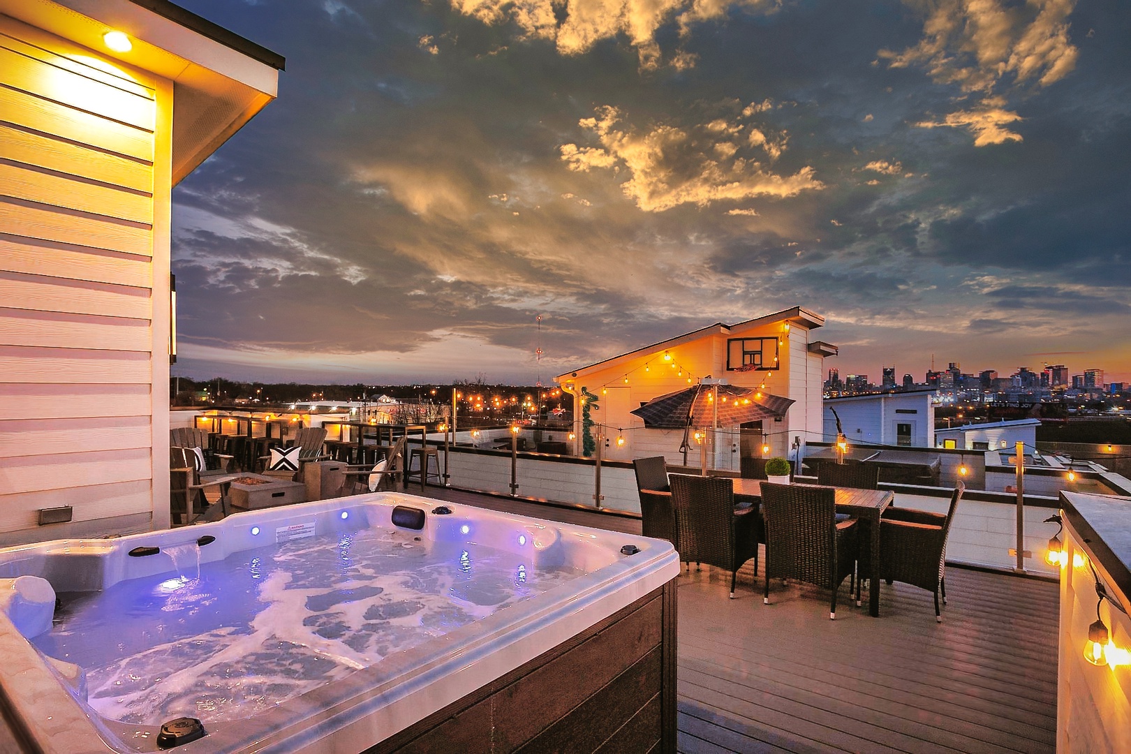 • Massive rooftop deck with city views, hot tub, fire pit – the perfect entertainment spot