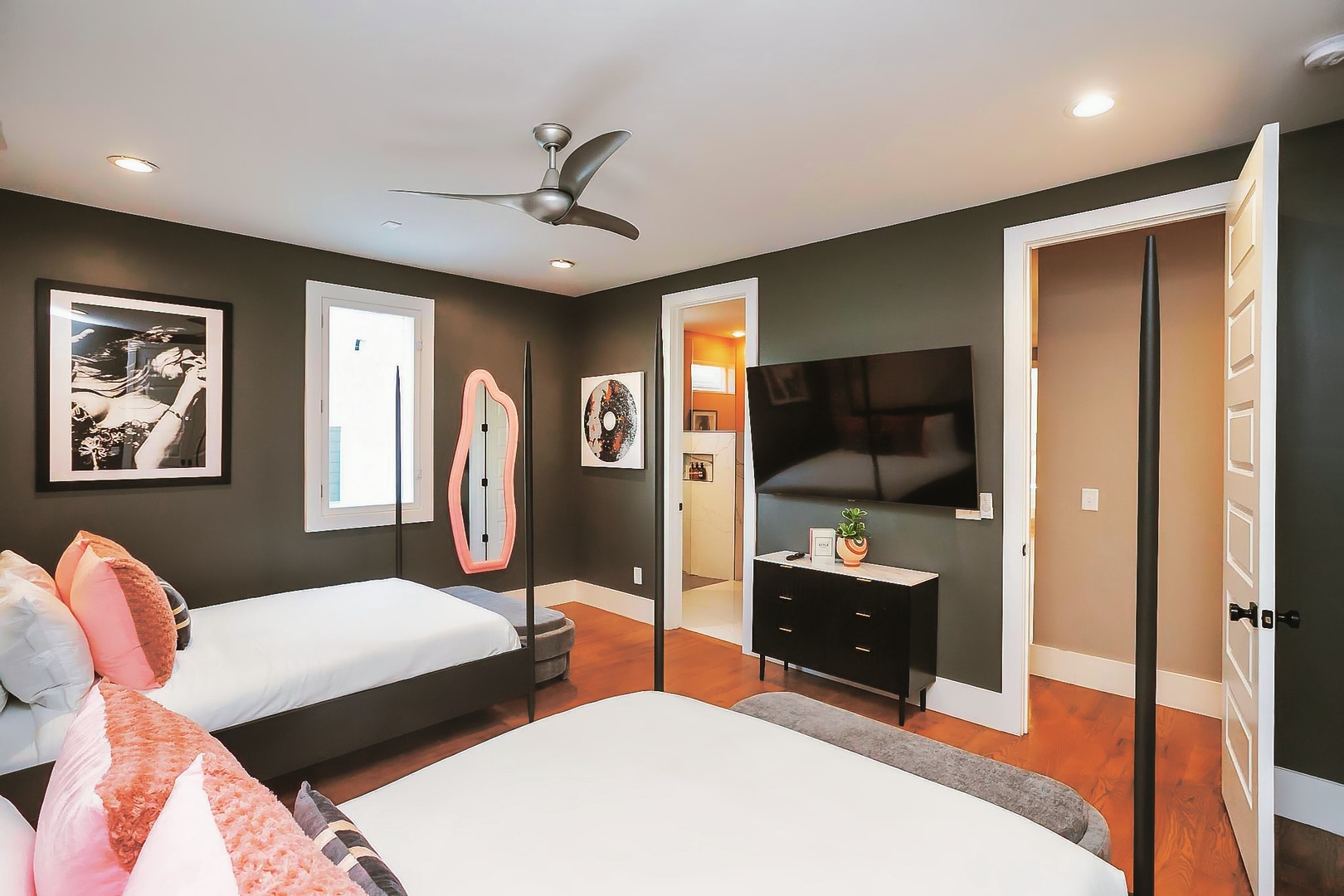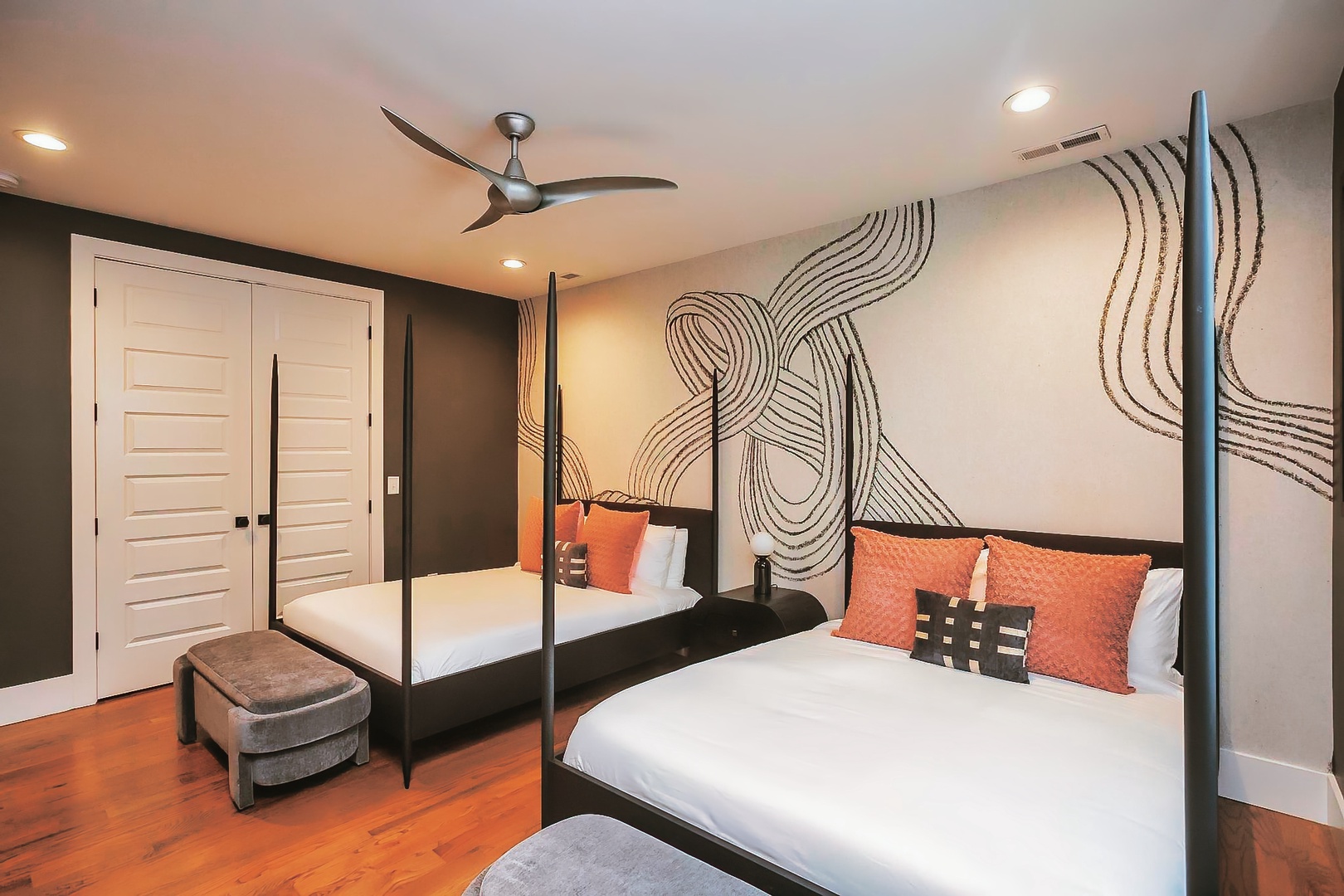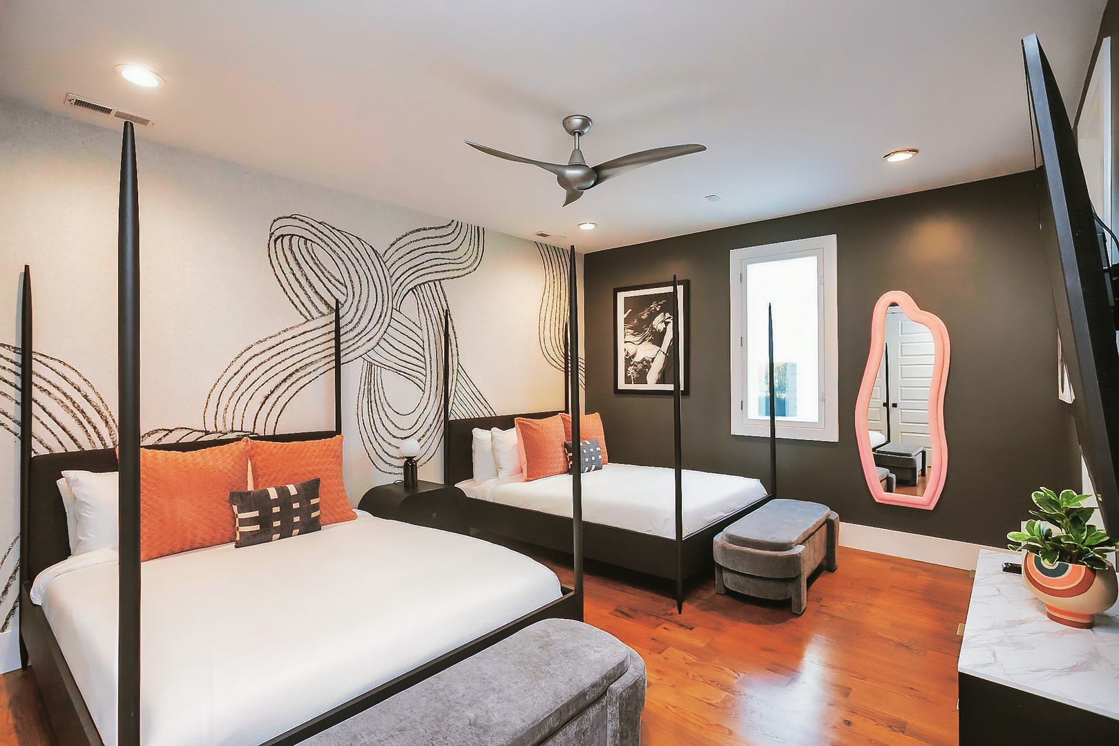 Cityscape Sanctuary boasts four thoughtfully appointed bedrooms, providing plush accommodations for a restful night's sleep after exploring all that Nashville has to offer. Each room exudes a unique charm, offering a blend of style and comfort for a rejuvenating stay.