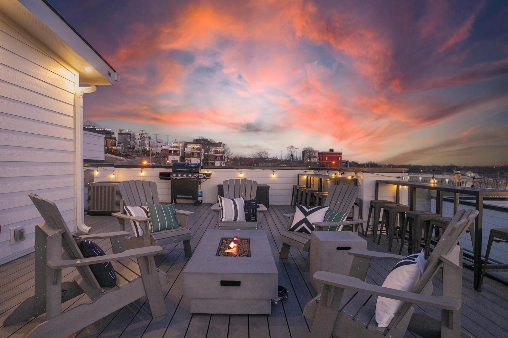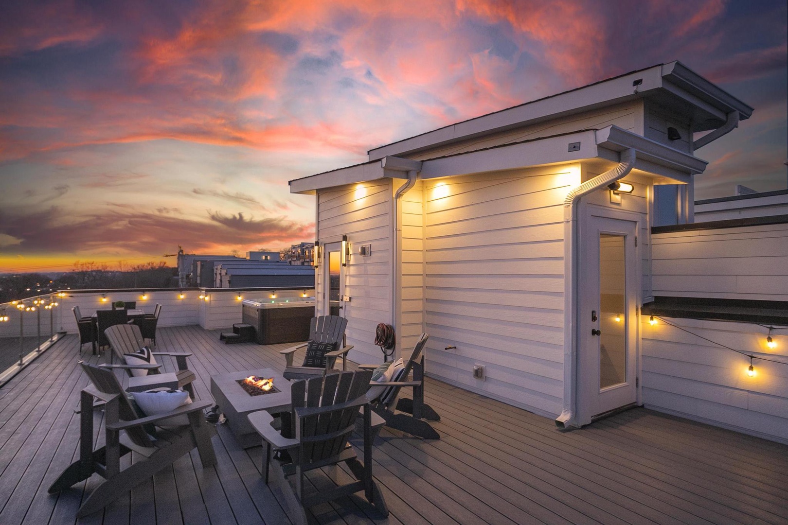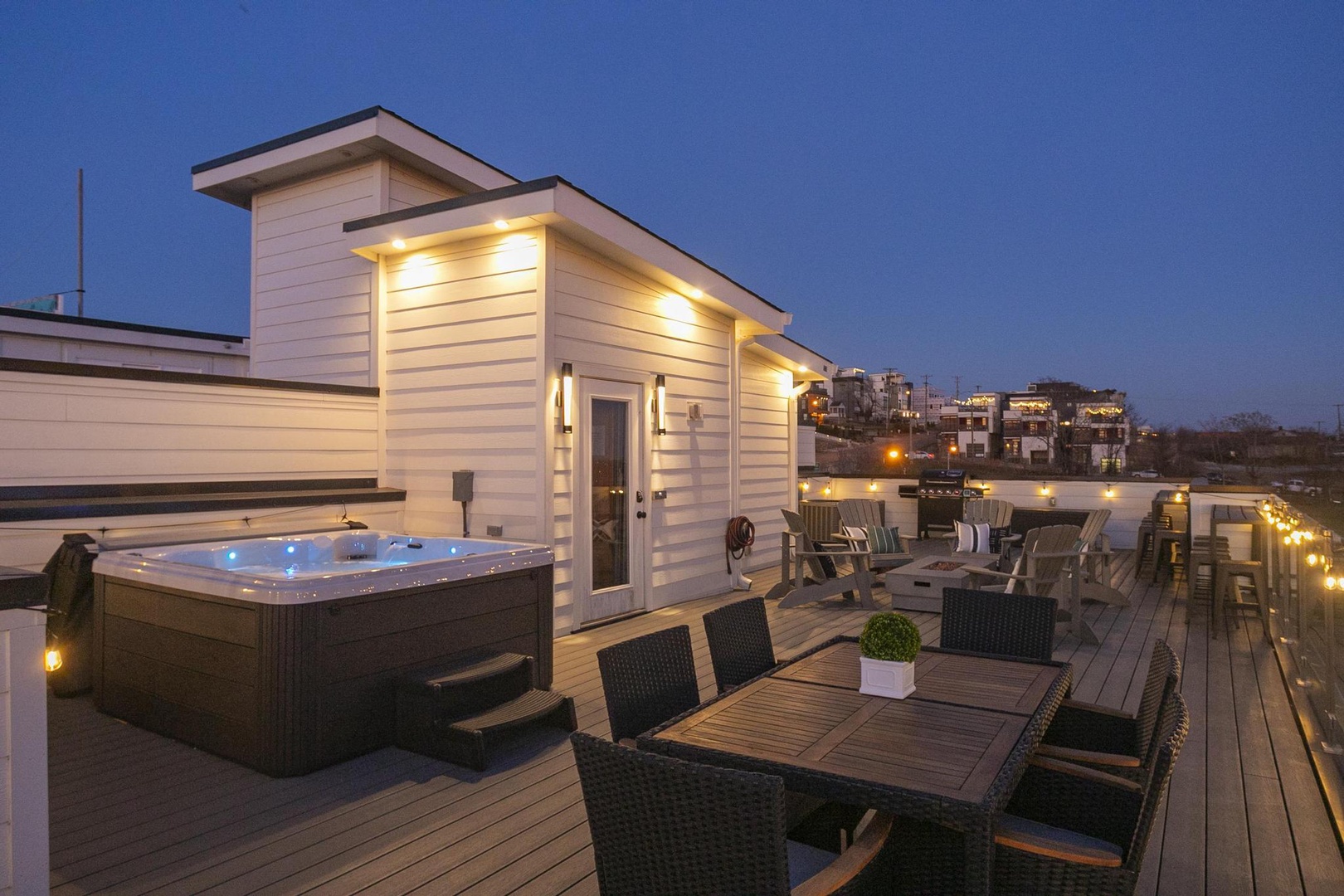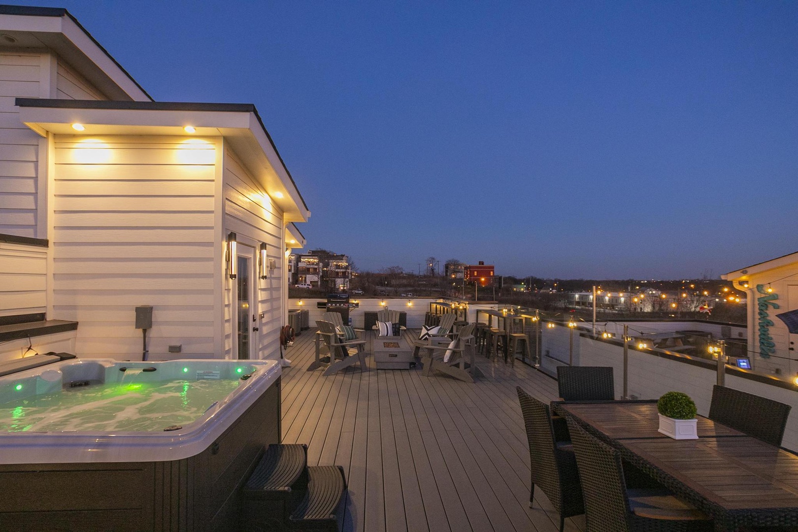 • Rooftop deck with fire pit, hot tub, BBQ, and seating areas