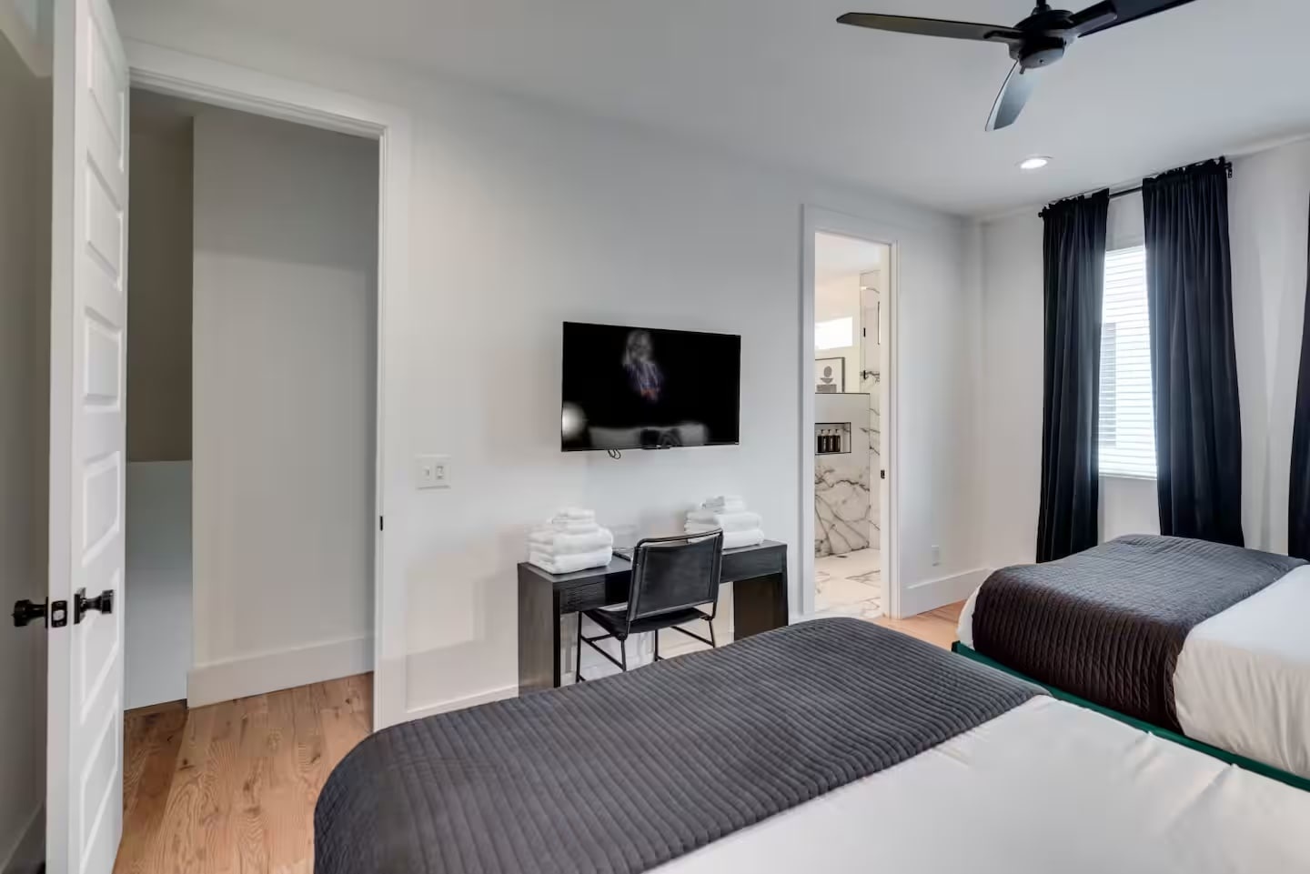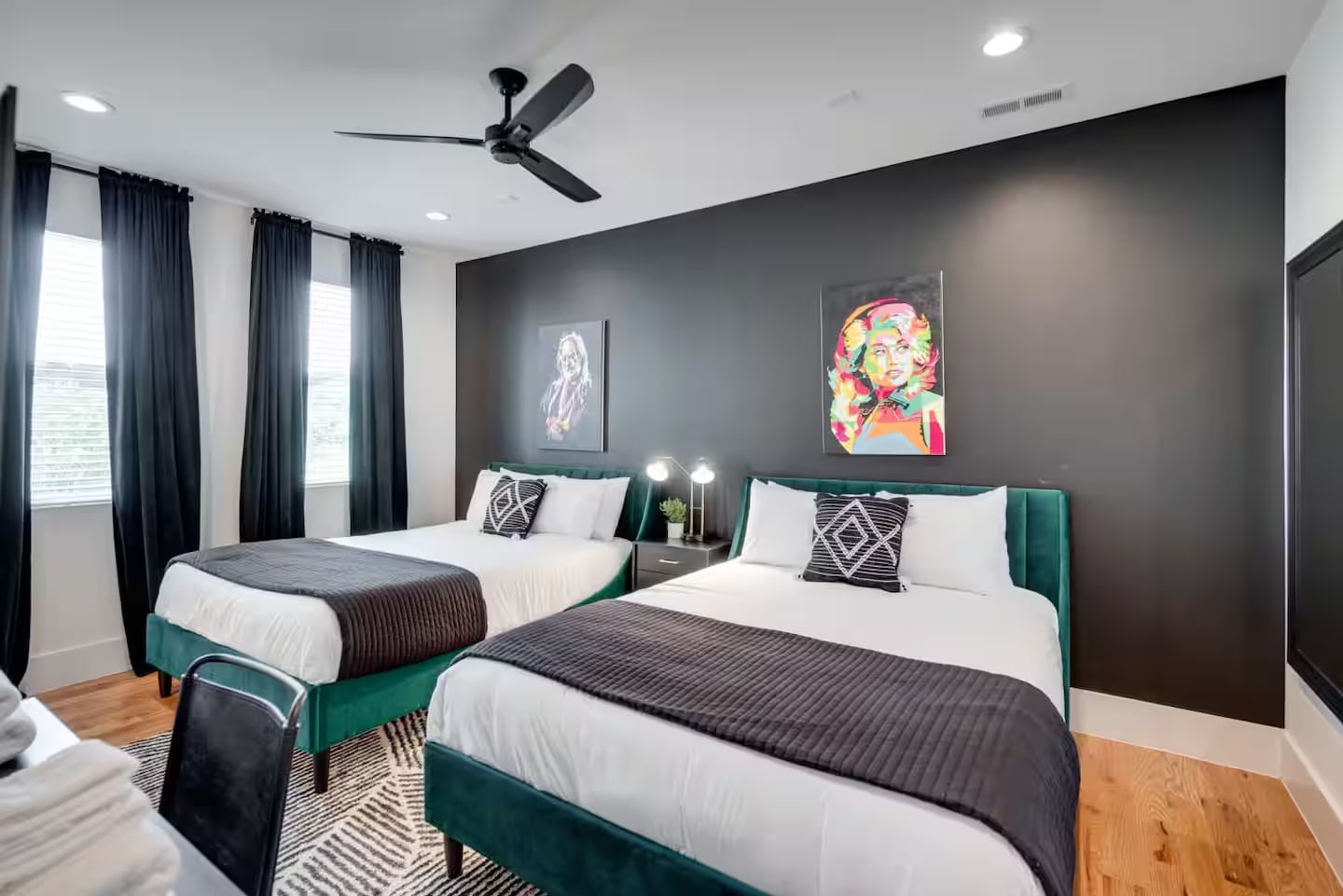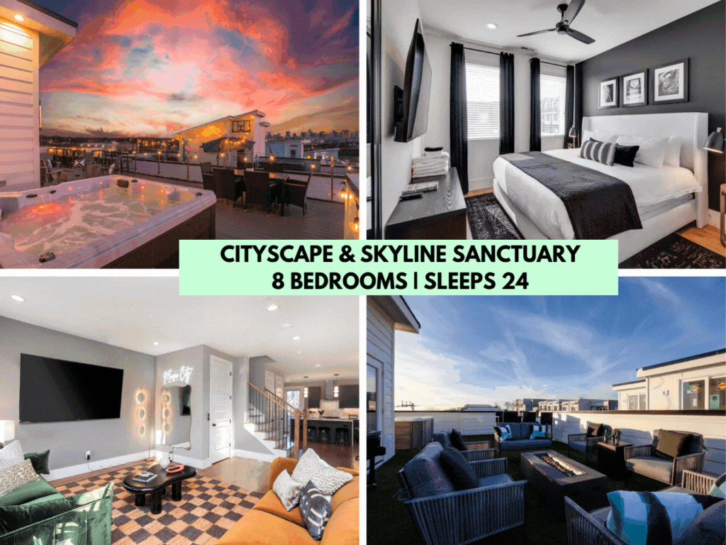 These two side-by-side homes hold up to 24! Cityscape & Skyline Sanctuary offers a spacious, thoughtfully designed layout spread across three levels. The fully equipped kitchen and dining areas are perfect for group meals, while the bedrooms offer ultimate comfort and privacy. With space for up to 24 guests, this home is ideal for bachelorette parties, milestone celebrations, or any group looking to indulge in luxury living.