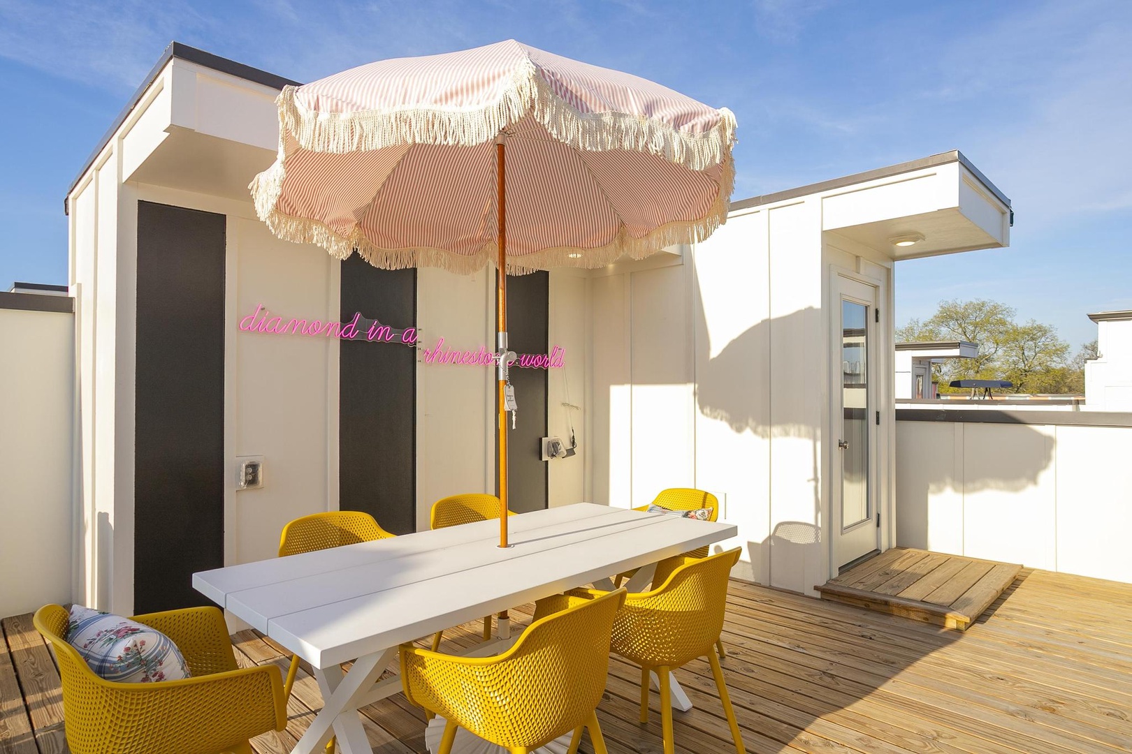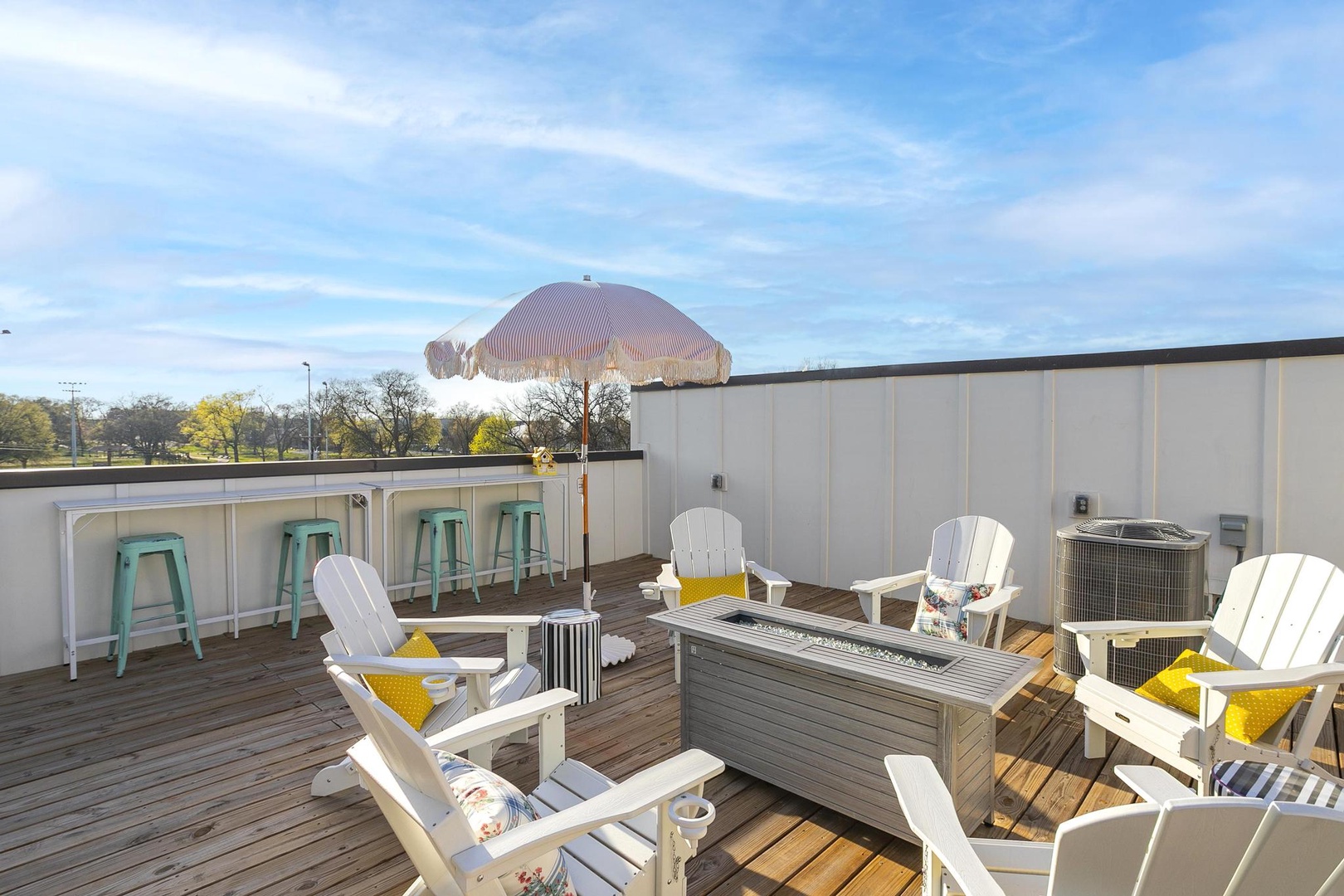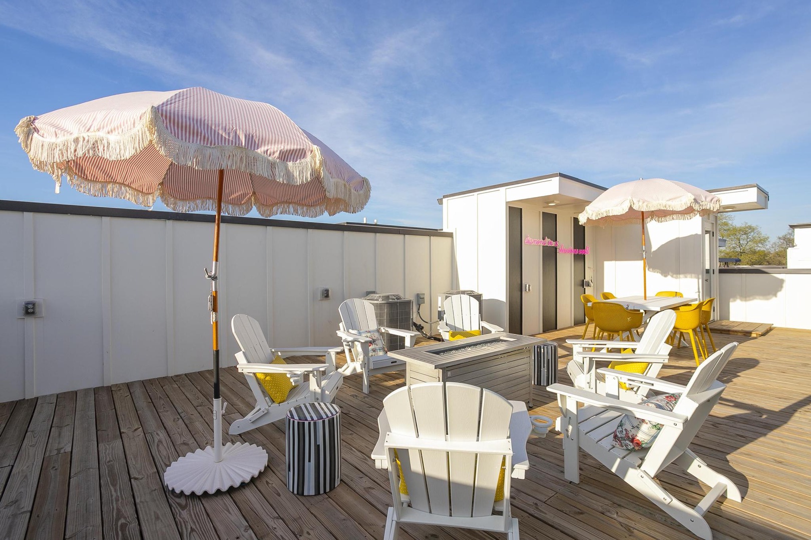 • Dolly-themed rooftop deck with park views, fire pit, BBQ, and eating area with umbrellas