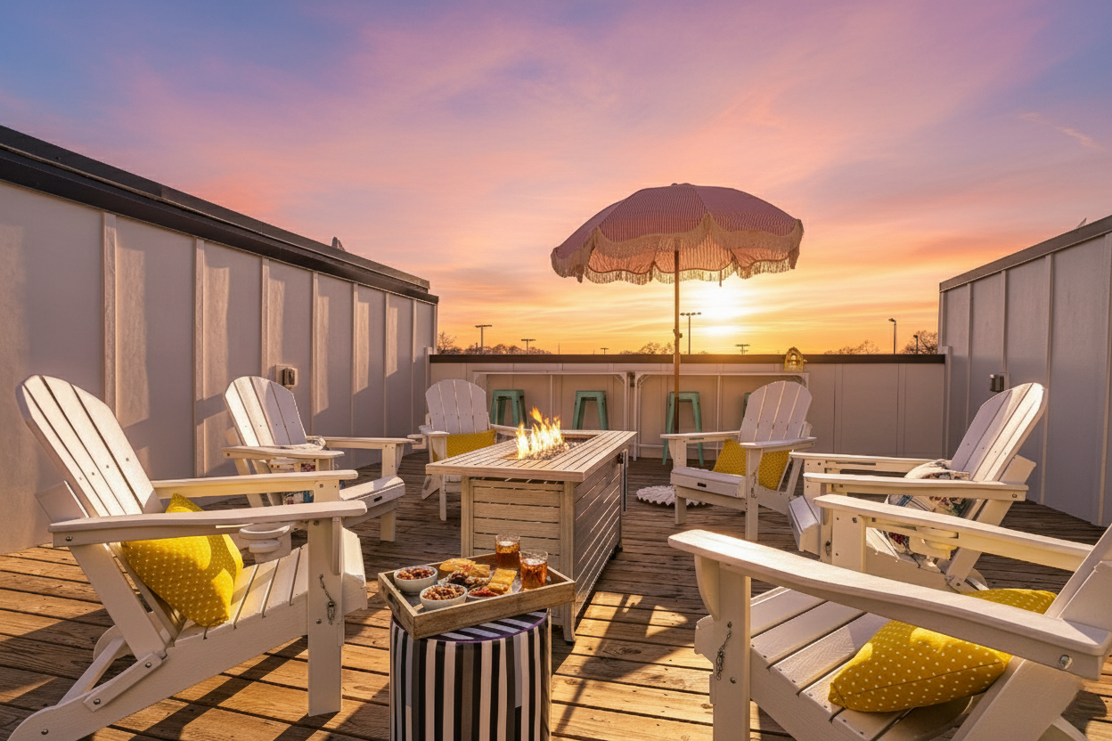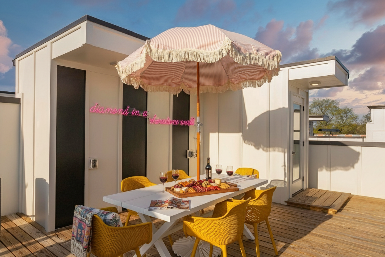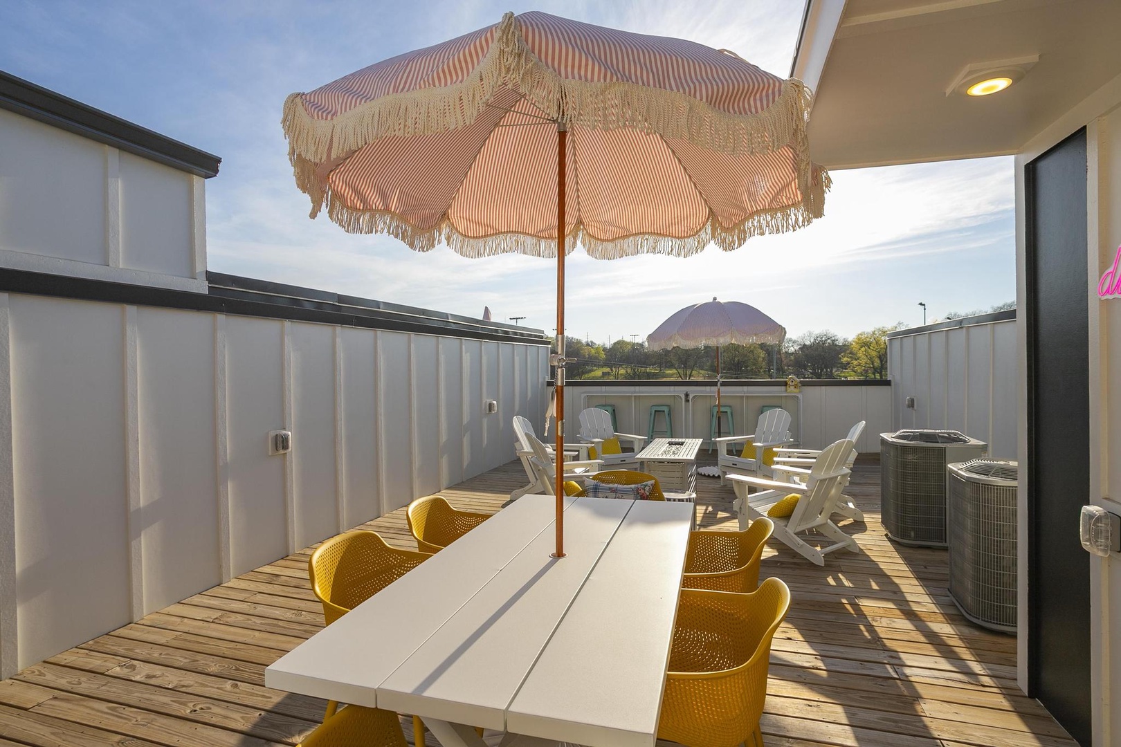 • Dolly-themed rooftop deck with park views, fire pit, BBQ, and eating area with umbrellas