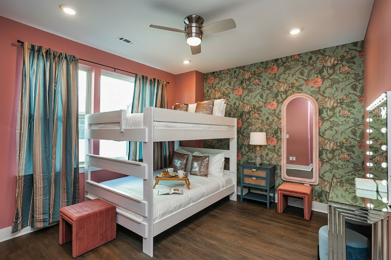 Dolly's Dream House boasts four thoughtfully appointed bedrooms, each named after a Dolly Parton hit, providing plush accommodations for a restful night's sleep after exploring all that Nashville has to offer. Each room exudes a unique charm, offering a blend of style and comfort for a rejuvenating stay.