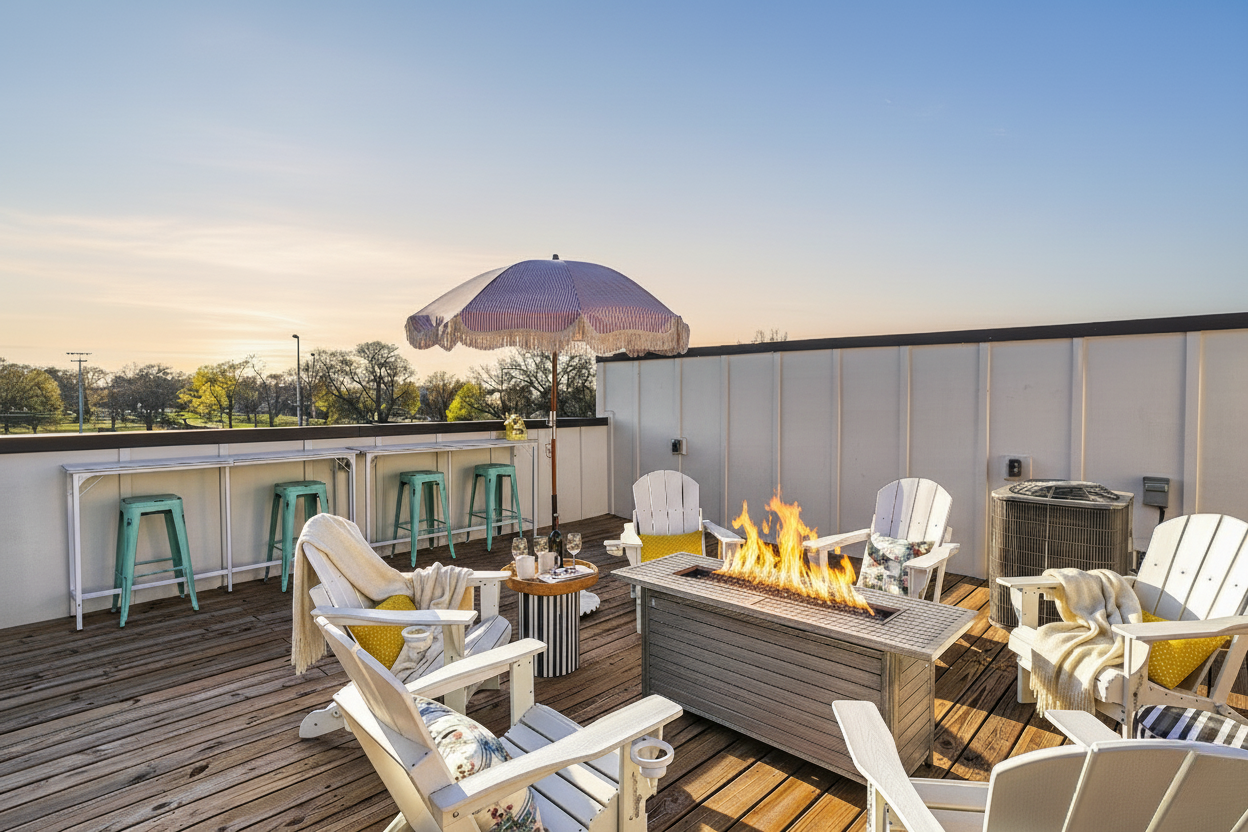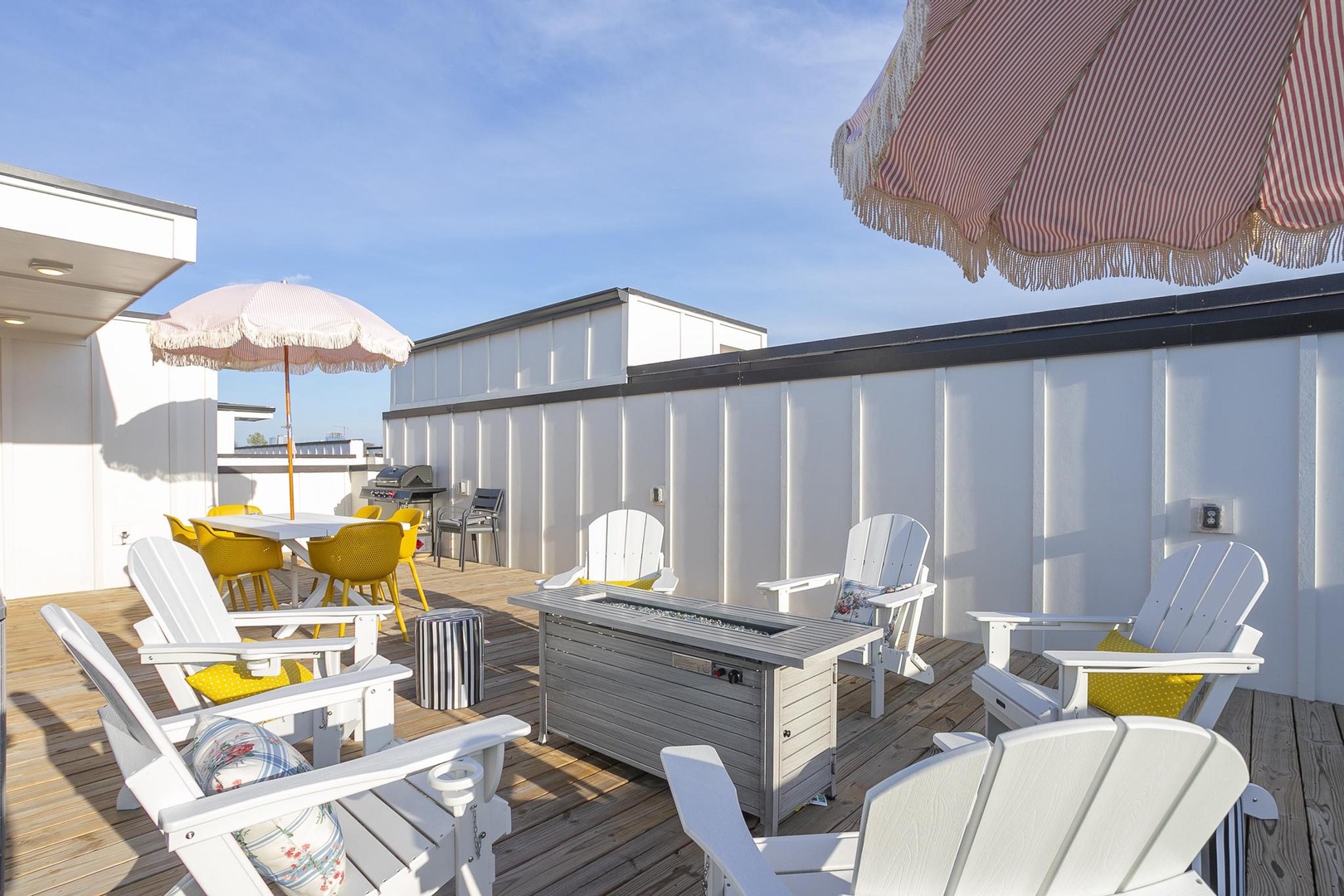 • Dolly-themed rooftop deck with park views, fire pit, BBQ, and eating area with umbrellas