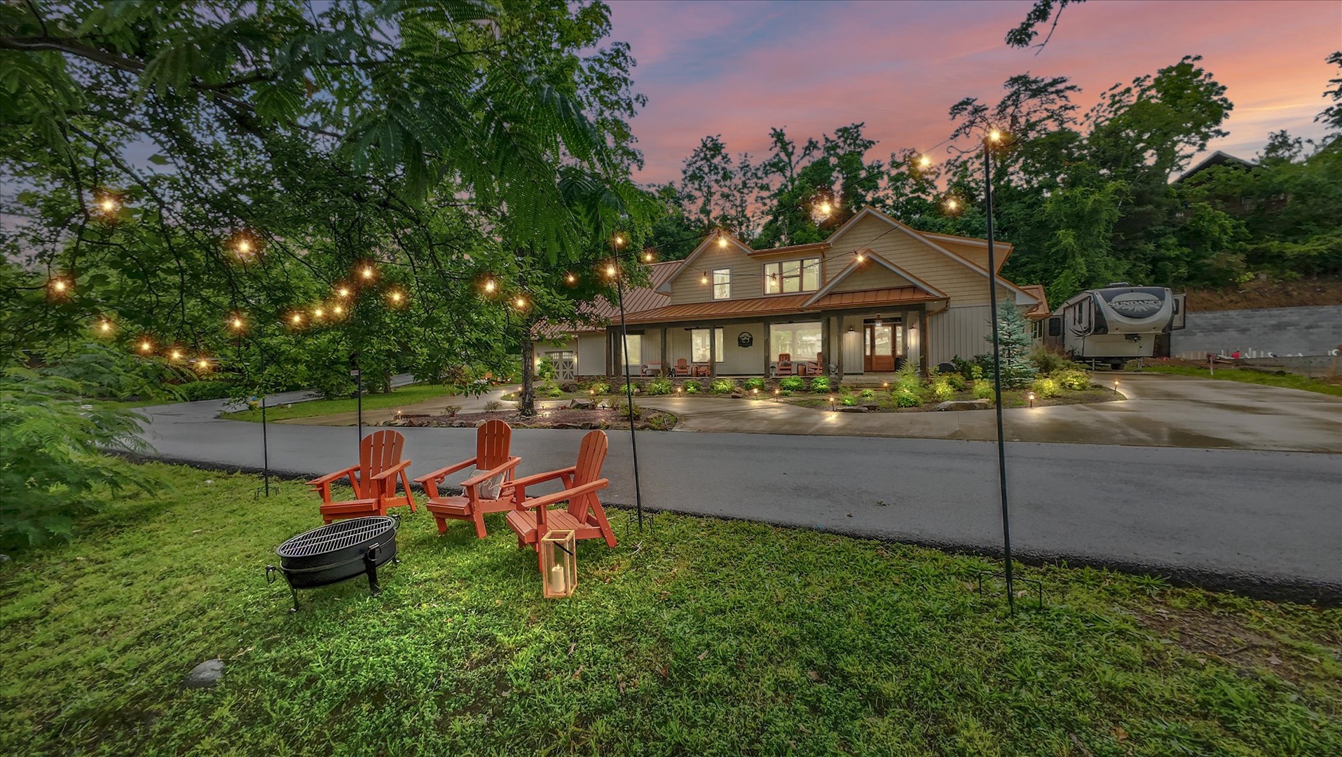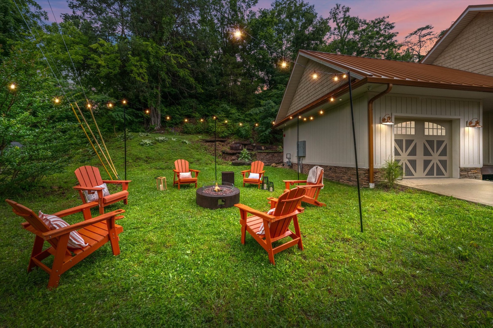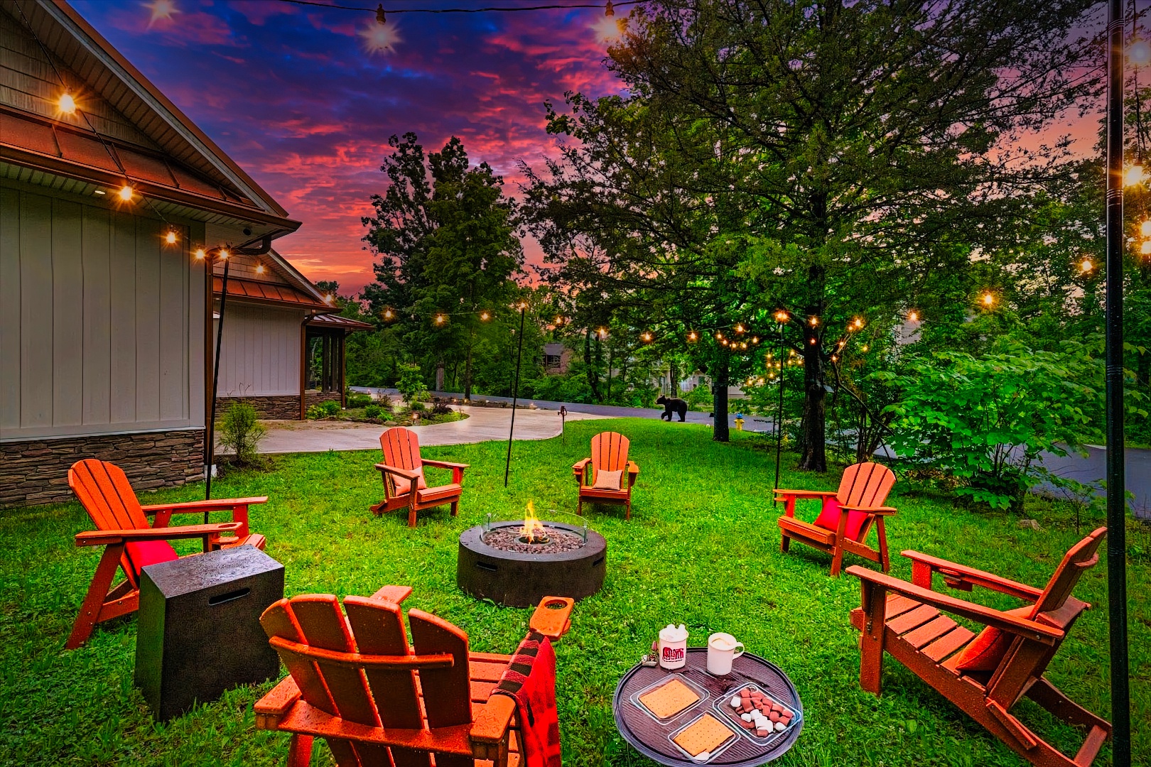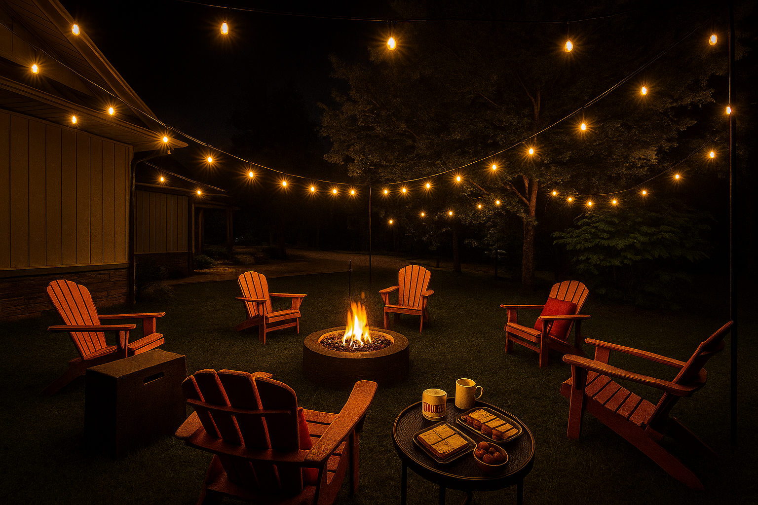 🔥 Fire Pit Vibes ➢ String lights, Adirondack chairs, and the river running in the background make every night magical.