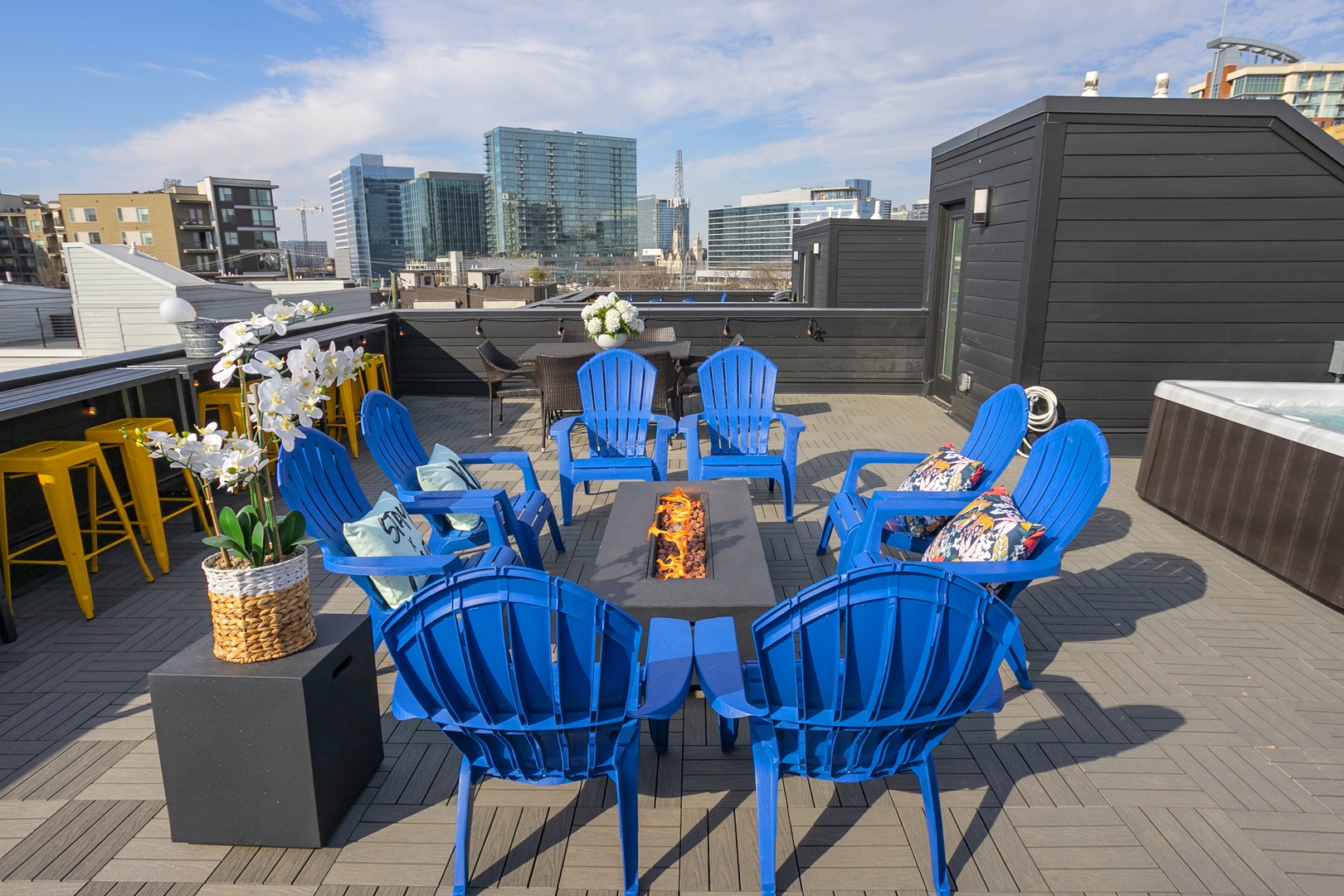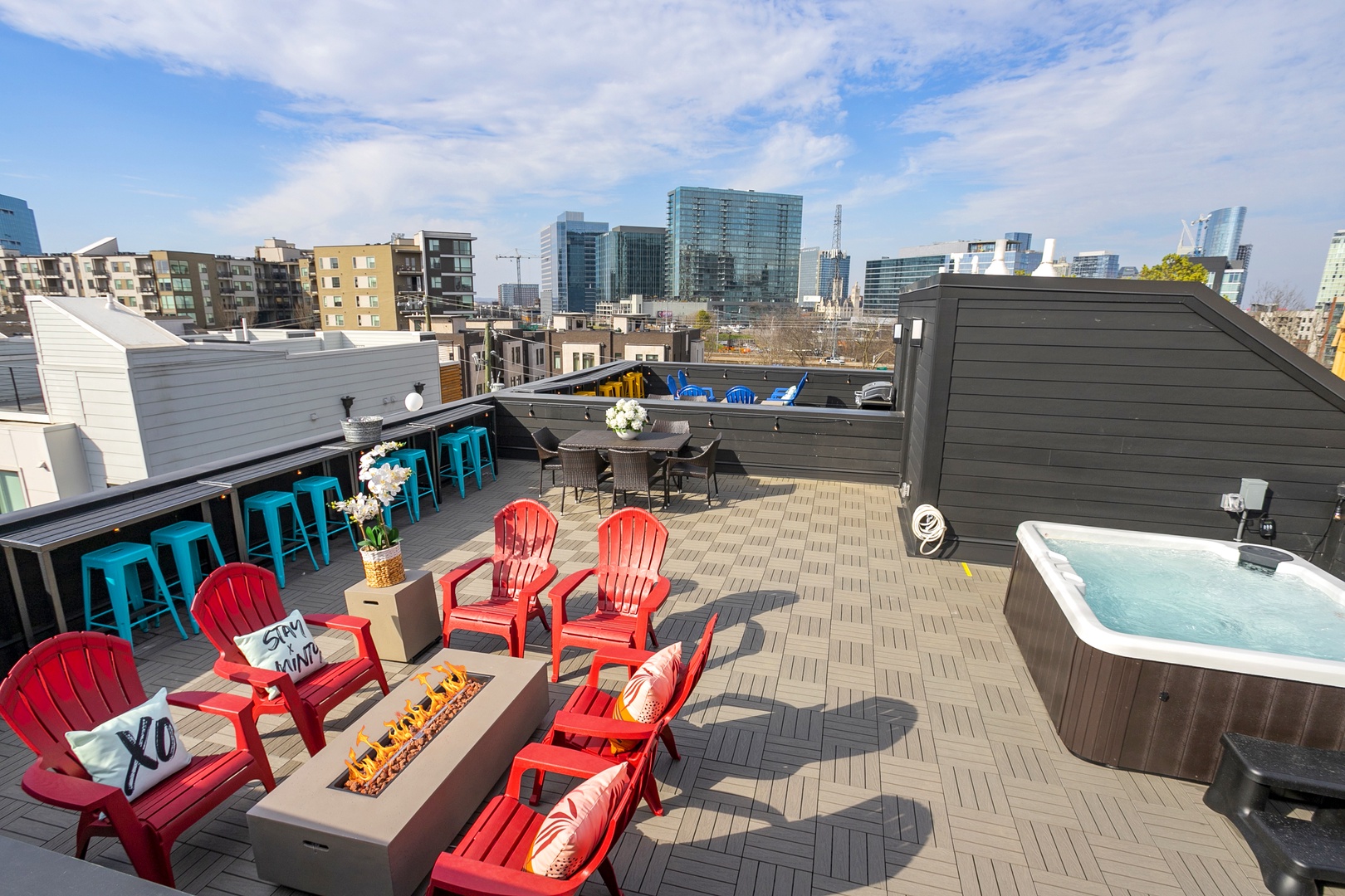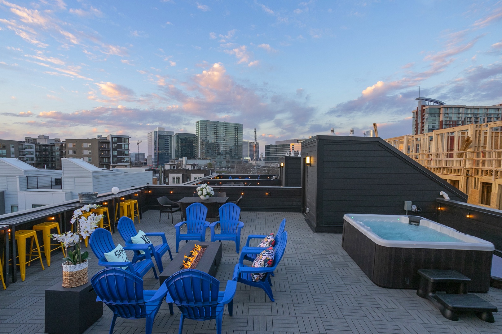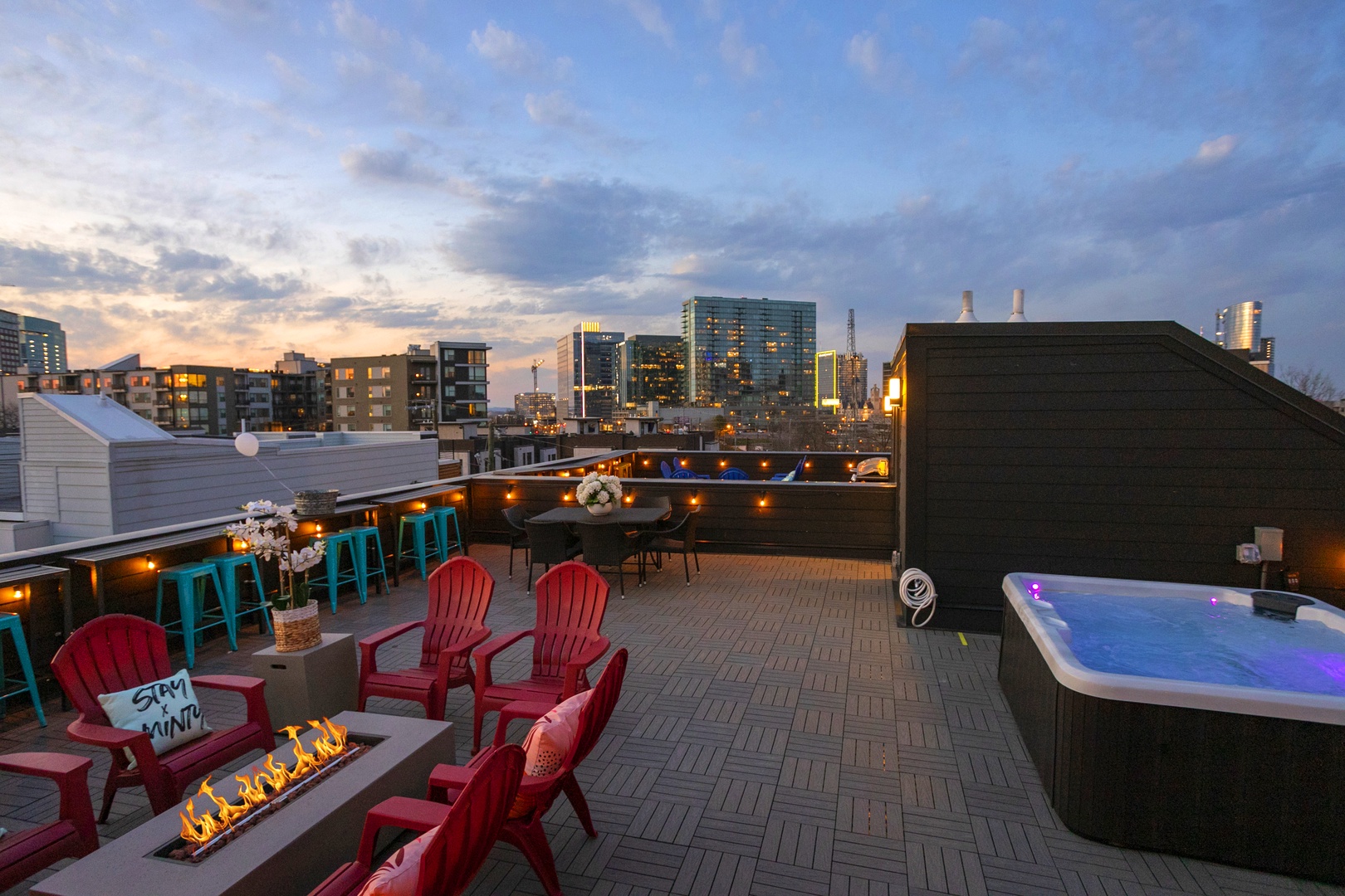 The rooftops are the reason this home is in such high demand. The star of the show is definitely the private hot tub on the rooftop with panoramic skyline views of Nashville. There's also a gas fire pit and grill as well as plenty of seating for everyone to relax and have a good time.